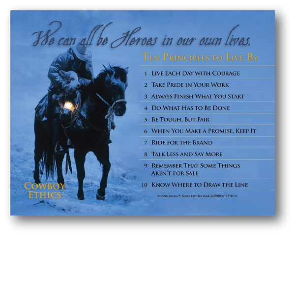 We created three posters, inspired by James Owens’ Cowboy Ethics books, to capture the “code of the west” and serve as a daily reminder of the values that guide us. They make thoughtful gifts for family, friends, clients, and colleagues and, whether displayed in a classroom, home, or office, these posters are always appreciated and admired. PLEASE NOTE: If you wish to purchase more than one poster, or more items with this order, please use the contact form below to request a special order. No international orders.